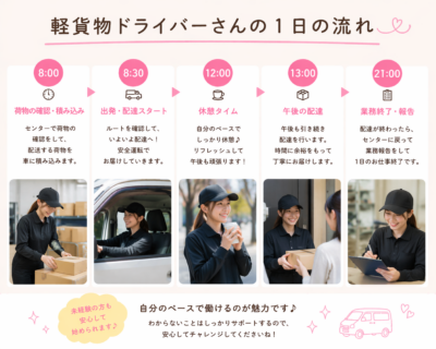 軽貨物配送に興味がある方、大歓迎です!弊社では経験不問でスタートできる環境が整っています。リース車がありますので車両の心配も不要。未経験の方でも安心して始められるよう、業界に精通したベテランスタッフが、運送業での稼ぎ方から一生この業界で働いていけるようサポートします。新しい一歩を踏み出すなら、ぜひOZ LOGISTで一緒に始めましょう!